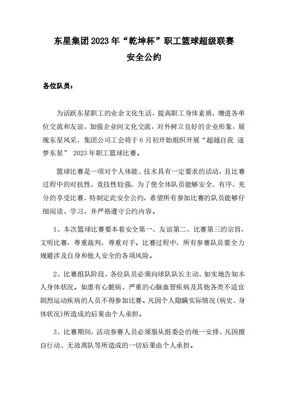 今天,小編懷著萬分激動的心情,帶著一條最新、最熱的重磅消息向您迎面走來… 一項能夠提高員工身體素質(zhì),增強團隊凝聚力,活躍業(yè)余文化生活,增進各單位交流和友誼的重要賽事——東星集團2023年“乾坤杯”職工籃球超級聯(lián)賽(DXBA)開賽在即啦~~~ 本次籃球聯(lián)賽由集團公司工會主辦,得到了集團公司各級領(lǐng)導(dǎo),尤其是董事長、總經(jīng)理于大偉以及各參賽隊領(lǐng)導(dǎo)的大力支持。全集團共有10支球隊、100名隊員參賽。目前,參賽球隊已通過抽簽的方式分為乾、坤組,小組循環(huán)賽后,每組前兩名的球隊將出線爭奪最終的冠、亞、季軍。 下面 大家快來跟我一起看看DXBA的賽程安排吧 注:如遇暴雨天氣或其他特殊原因無法比賽,時間另行調(diào)整。 集團公司特制定了安全應(yīng)急預(yù)案確保本次籃球賽的順利進行,預(yù)案結(jié)合醫(yī)療、安保、防暑降溫等各方面工作部署,全方位為賽事提供服務(wù)和支持。 1.集團公司工會下發(fā)《安全公約》,各代表隊領(lǐng)隊進行安全宣傳,明確職責,熟悉內(nèi)容,切記安全第一、友誼第二、比賽第三的原則;各代表隊領(lǐng)隊在賽前需帶領(lǐng)球員熟悉場地和疏散路線圖;各領(lǐng)隊要安排專人為隊員準備好防暑降溫飲品。 2.集團公司生產(chǎn)管理部安排安全專員全程跟進賽事,賽前認真檢查比賽器械、場地和消防通道,維護賽場秩序,測量球員體溫,保證比賽安全。 3.東星醫(yī)院派出專業(yè)的醫(yī)護人員攜帶醫(yī)療器械配合比賽。醫(yī)護人員指導(dǎo)所有球員進行抗原檢測,同時,準備好氧氣袋和急救藥品以備不時之需。 4.比賽組委會隨時注意天氣變化,若有不適宜比賽的天氣,及時將順延、停賽等信息通知各參賽隊相關(guān)人員。 1.比賽過程中,各隊領(lǐng)隊必須到場,隨時維持現(xiàn)場秩序、做好應(yīng)急準備。 2.各位球員必須嚴格遵守比賽規(guī)則,不得起沖突、尋釁鬧事,如有違反,嚴格按照《安全公約》中的規(guī)定給予罰下或取消比賽資格的處罰。 1.各隊負責維持好現(xiàn)場秩序,保證人員安全退場,避免發(fā)生碰撞。 2.各隊負責好場地的清理工作,帶走場地垃圾,保持東星集團一貫以來良好的企業(yè)形象。 突破極限,超越自我,這是東星人在賽場上的最美姿態(tài),也是東星人飽含斗志、滿懷激情的宣言!在這個熱烈的夏天,隊員們將用一個個精彩瞬間展現(xiàn)東星人昂揚向上的精神風(fēng)貌,讓我們拭目以待! 愿以這場籃球賽 紀念那些 過去的 再不回頭的 你的 我的 他們的 永恒的 青春 ……