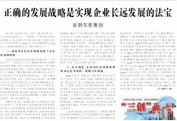 在8月1日發(fā)表的日報(總第6037期)頭版,刊登了題目為《正確的發(fā)展戰(zhàn)略是實現企業(yè)長遠發(fā)展的法寶》的文章,廣泛宣傳、介紹東星集團在開展“三創(chuàng)”活動中的典型經驗,總公司網站同日轉載。