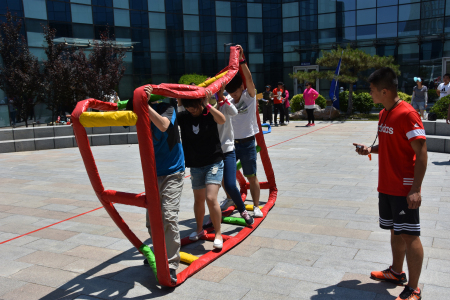 首先進行的項目是:勇往直前。每隊4名隊員通過協(xié)作配合,使比賽器材在跑道上快速行進。通過這個項目讓參與人員在輕松愉快的氛圍中,體驗團隊的力量和協(xié)作、配合的重要性。接下來是一個集體項目:待人接物。團隊成員站成一圈,依次拋球,雙手接球,球不能落地。參與者要在項目中體會團隊成就感;培養(yǎng)員工如何待人接物;培養(yǎng)團隊步調(diào)一致性。第三個培訓(xùn)項目是每個小隊的人員,面朝同一方向,由最后排的人員將一系列數(shù)字,通過各種有效的方法傳至最前面的人員處,中間不能出錯。項目取名:驛站傳書。這個項目給我們的啟迪是:成員之間主動溝通和相互信任的重要,鍛煉了理解和相互合作的團隊精神,通過傳遞者與被傳遞者不同的感受,體會合作的重要性。最后的項目是:財源滾滾。4名隊員通過手腳協(xié)作配合,撥動比賽器材向前行進。這個項目活躍了集體氣氛,增強團隊的凝聚力,增強了人與人之間相互關(guān)心、相互激勵、相互理解、相互合作的團隊精神。