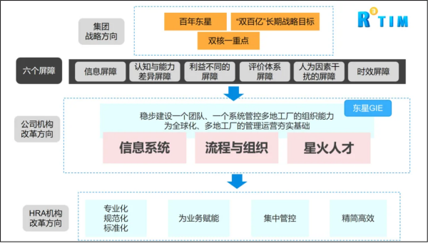 2022年以來,東星集團(tuán)以“雙百工程”為目標(biāo),以“雙核一重點”戰(zhàn)略為指引,全面推進(jìn)R3TIM六項系統(tǒng)工作,業(yè)務(wù)發(fā)展穩(wěn)步由“供應(yīng)全球”向“全球供應(yīng)”轉(zhuǎn)型。通過戰(zhàn)略、流程與組織、信息系統(tǒng)及東星星火人才四個層面的深化改革,逐步打破信息壁壘、時效低、認(rèn)知與能力差異、利益不同、評價體系不同、人為因素干擾等帶來的六個影響組織效率的屏障,鑄造敏捷前臺、強(qiáng)系統(tǒng)強(qiáng)中臺、精簡集成共享的強(qiáng)支持后臺的核心競爭力,實現(xiàn)一個系統(tǒng)、一個團(tuán)隊管控多地工廠,建設(shè)“全球集成管理式企業(yè)”-東星GIE。隨著機(jī)構(gòu)改革持續(xù)深入推進(jìn),目前已完成前臺組織CTS\DRDC\DAMT和強(qiáng)中臺組織CSCL\iSIM的搭建,多地子公司投入運(yùn)行,公司對行政、人力資源等后臺部門的價值和效能提出了新的管理需求,后臺機(jī)構(gòu)改革勢在必行。