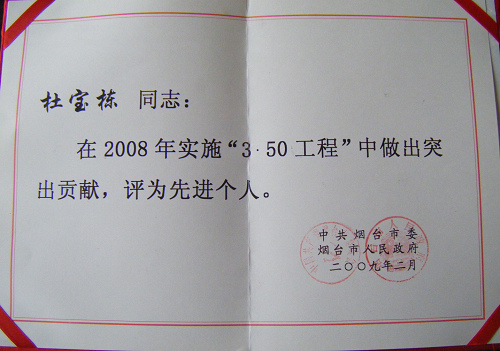 程”先 進(jìn)集體榮譽(yù)稱號,董事長杜寶棟被評為實(shí)施“3.50工程”先進(jìn)個(gè)人。